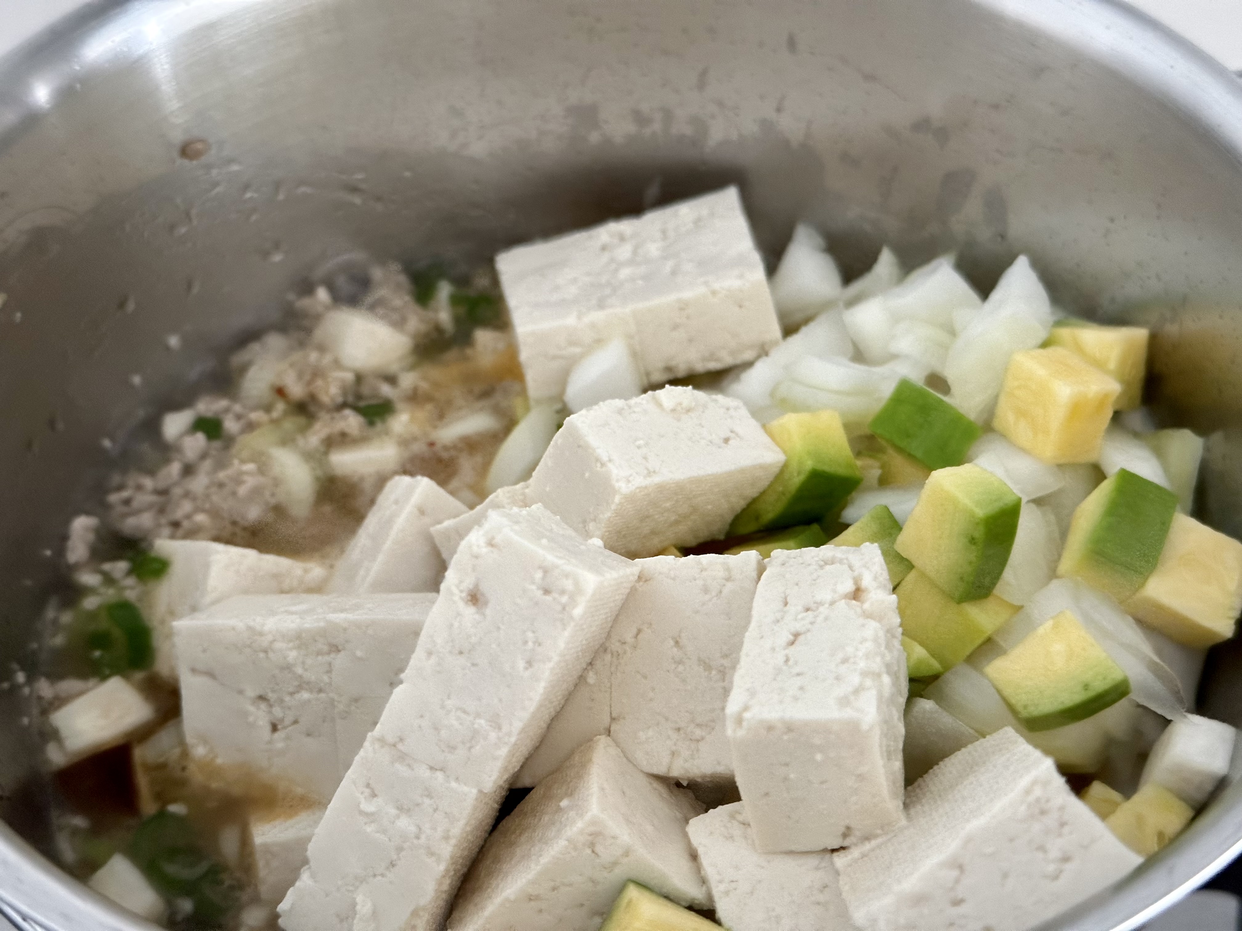 6. 마지막으로 두부와 애호박, 양파를 넣고 3~분정도 팔팔 끓여주세요.