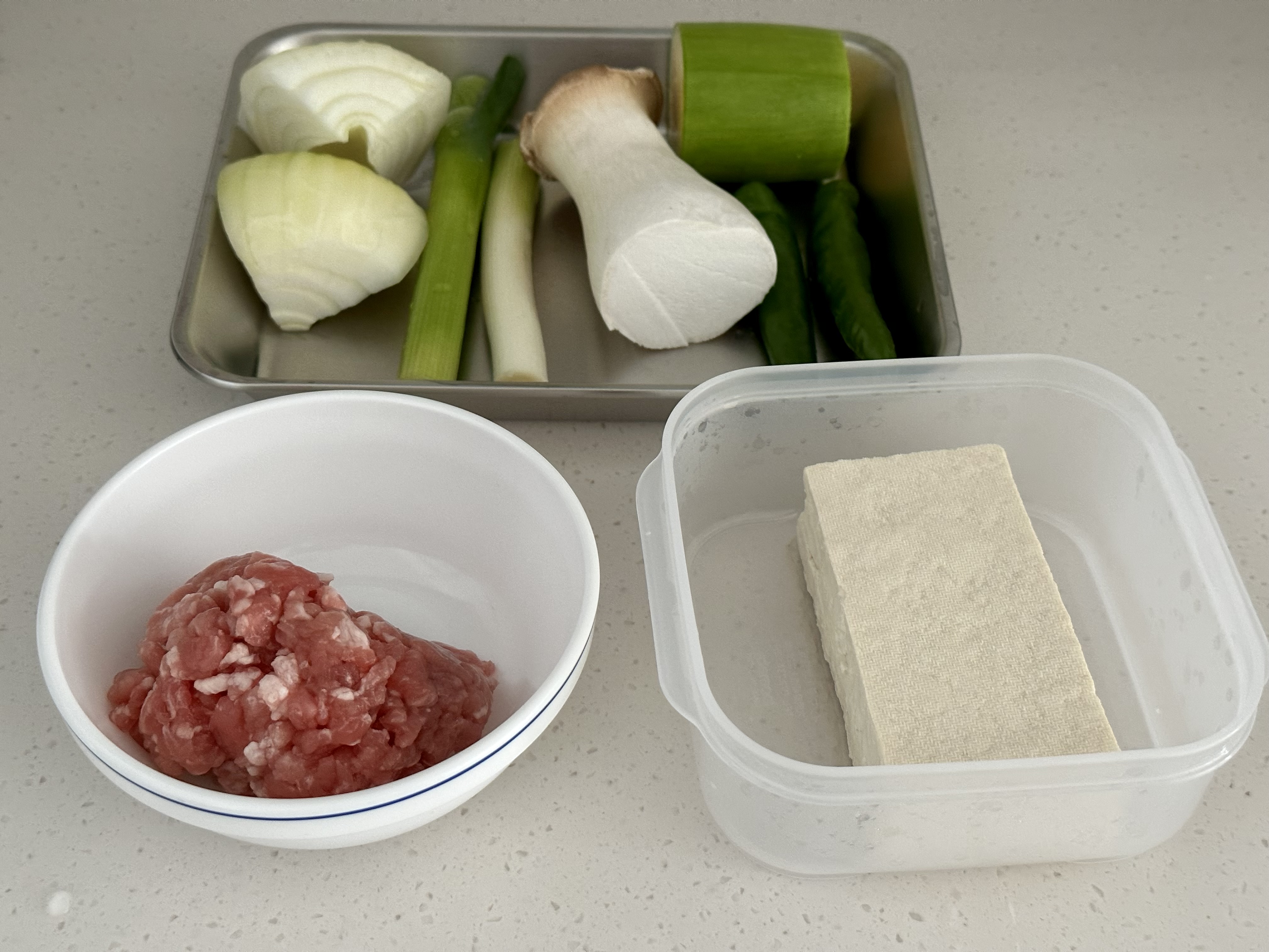 재료: 돼지고기 다짐육 100g, 양파 반 개, 새송이 한 개, 대파한대, 애호박 1/3개, 청양고추 2개, 두부반모, 물 150ml, 코인육수 1개(멸치육수 있으시면 사용하시면 좋아요), 참기름 1T, 다진 마늘 1T
