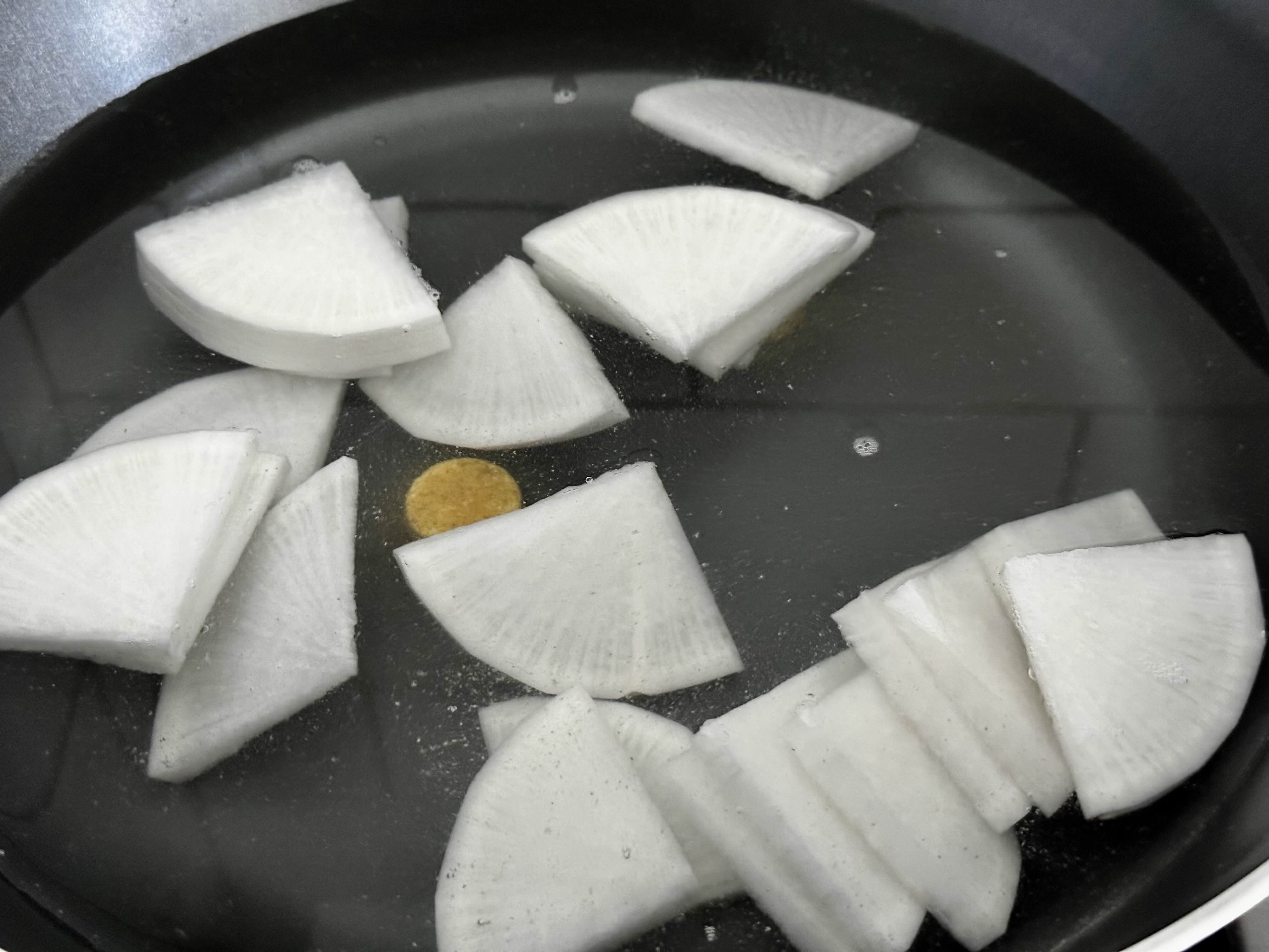 3. 이제 물 1리터에 코인육수 2알을 넣어주시고 무를 잘 잘라서 같이 끓여주세요.