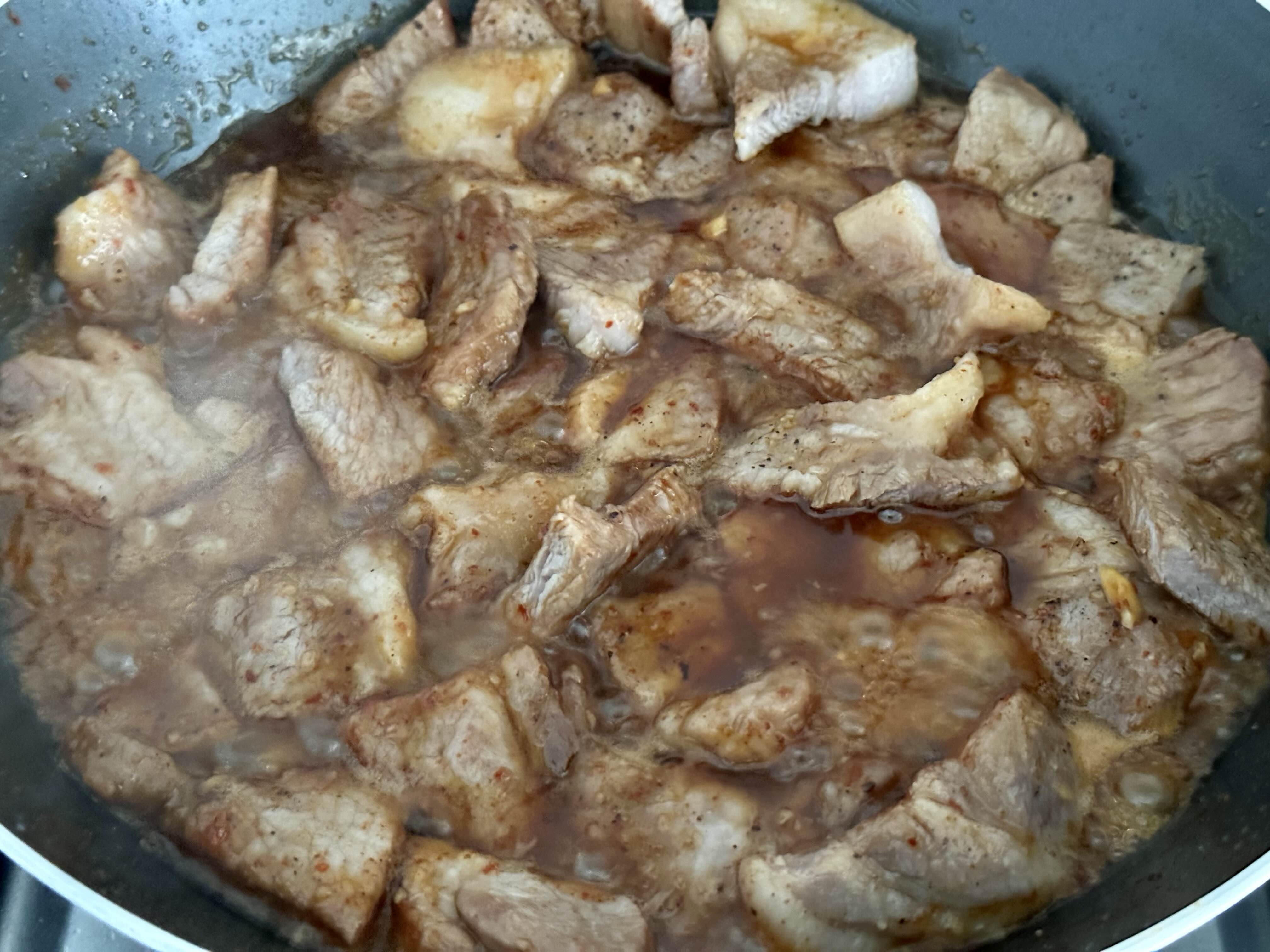 4.고기를 완전히 익히지 마시고 살짝만 앞뒤로 뒤집어 가면서 구워주세요. 그 다음 양념을 부어 중강불로 끓여주세요.