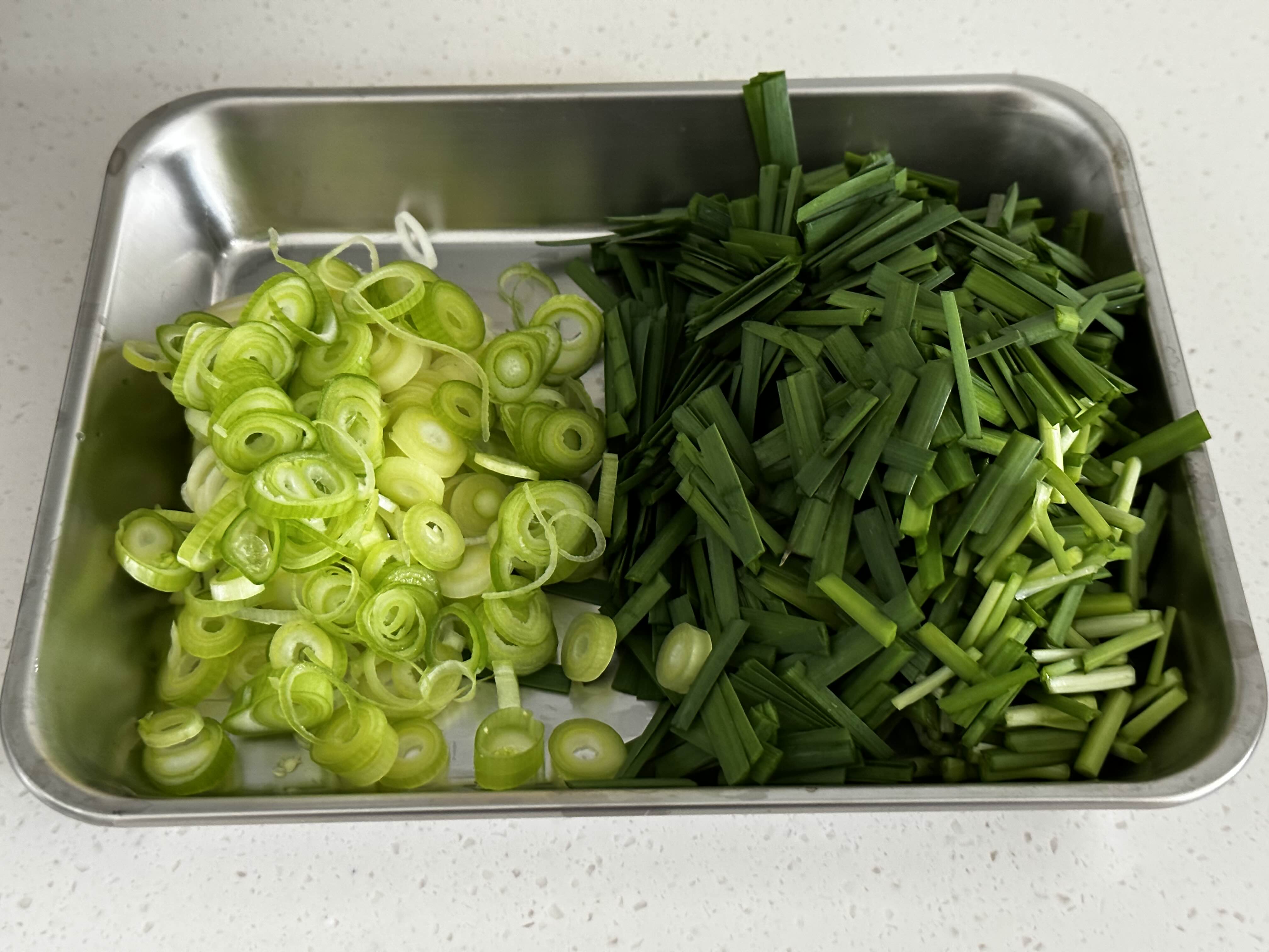 6. 부추는 100g 정도 잘게 썰어 사용하시면 되고 대파는 2인분 기준으로 흰 부분 2대를 사용하시면 돼요.